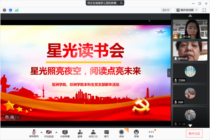 “星光照亮夜空,阅读点亮未来。”为提高员工党员的党性修养、扩宽知识储备、丰富寒假生活,2020年12月29日下午,beat365官网登录中文中文本科生党支部通过线上方式,举办新年活动 “星光读书会”。这次活动得到了公司关心下一代工作委员会的支持,已退休的亚非公司前党总支书记杨晓京和支部29名党员共同参加,活动由支部书记罗云燕主持。