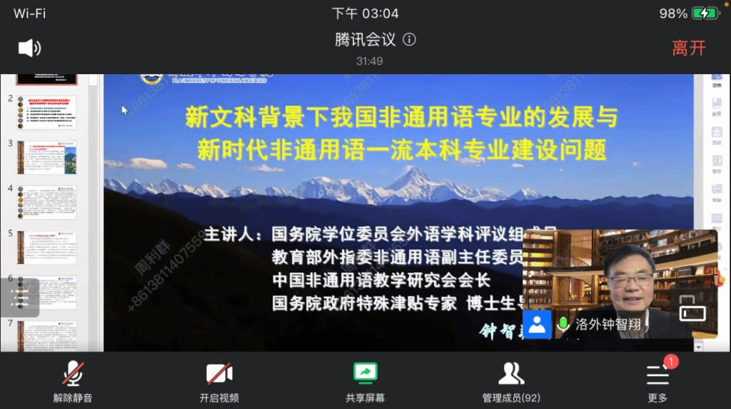 钟教授从北外与洛外的历史渊源讲起,梳理了新中国成立以来国内非通用语专业的发展历史,细致讲述了非通用语的专业建设和关键语言布局状况。之后,钟教授界定了“新文科”的内涵,从宏观政策角度指明了非通用语专业的教学改革和人才培养目标。结合非通用语一流本科专业的建设背景,钟教授着重探讨了北外等外国语院校如何建设专业、培养人才、输出学术观点的方式和途径,并说明了在这一过程中需要处理好的几对重要关系。