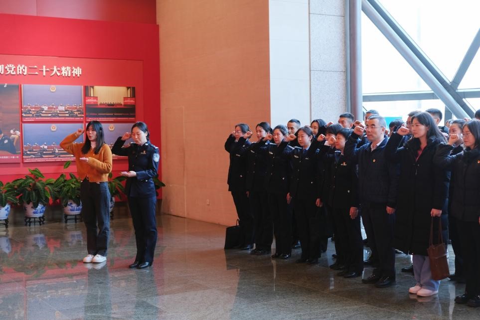 观展结束后,党员代表冯晓瑾、曾振鹏分享了参观心得感悟。随后,两支部成员由组织委员李晓旭、宣传委员任睿哲同志领誓,在场馆内重温入党誓词,包括本科生党支部9位新发展的预备党员、4位新转正的正式党员在内的40余名党员在党旗的见证下共同宣誓,为共产主义奋斗终身。