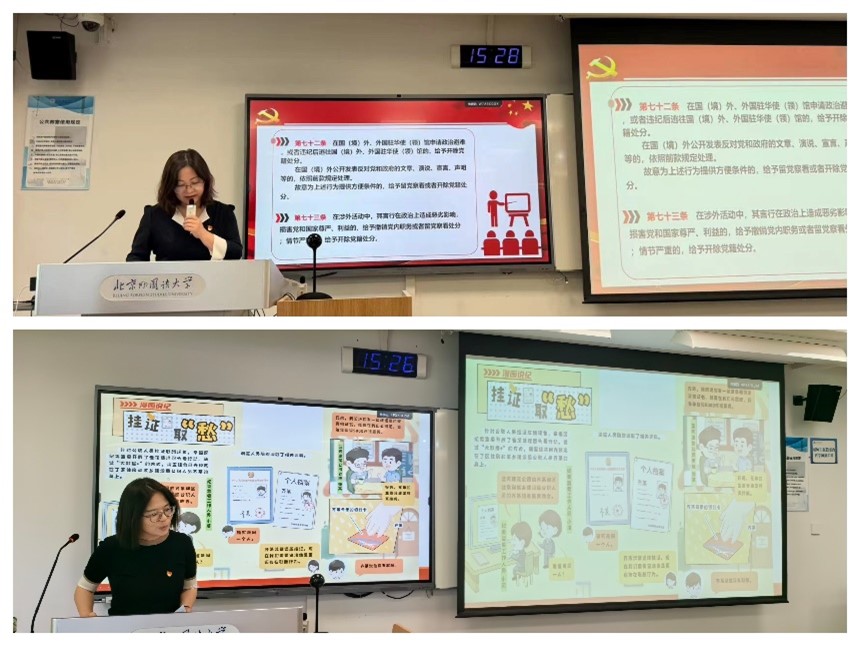 之后,为推动党纪学习教育在党员教师中走深走实,beat365官网登录中文中文教工一支部和二支部分别进行了支部党纪学习。一支部书记钟珊和二支部书记曾琼分别在本支部讲授专题纪律党课,两位书记以讲促学、以讲带学,结合具体案例对党员教师进行了警示教育。