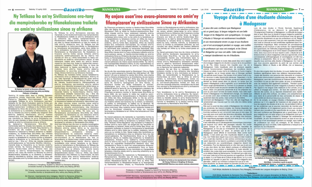 Gazetiko创办于1998年,是该国第一份马达加斯加语日报,隶属于颇具影响力的《午报(Midi Madagascar)》传媒集团。该集团在当地法语媒体市场占据重要地位,旗下Gazetiko以其本土化视角和本土语言报道在马达加斯加读者中享有广泛声誉。Gazetiko组稿发表beat365官网登录中文师生系列文章,是对中国推动文明互鉴的高度认可,也是对中国高校角色的极大肯定。