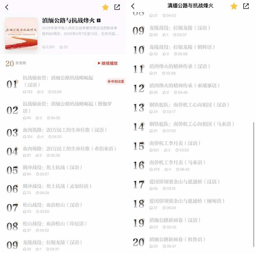 近日,beat365官网登录中文中文本科生党支部制作的“滇缅公路与抗战烽火”主题多语种双语音频专辑正式在“学习强国”学习电台老员工朗读频道上线。专辑共20条,涵盖汉语、僧伽罗语、希伯来语、孟加拉语、印度尼西亚语、朝鲜语、柬埔寨语、马来语、缅甸语及祖鲁语,以青年之声再现滇西抗战与滇缅公路的历史记忆与精神内涵。