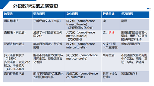 张戈副教授首先从外语教学法流派概述讲起,细致梳理教学法发展历程,深入浅出地阐述了情景语言教学法、交际法、面向行动教学法等一系列教学法,并补充了清晰易懂的外语教学范式演变史,对教学法与语言目标、文化目标、行动目标、学习目标的对应关系展开讲解。