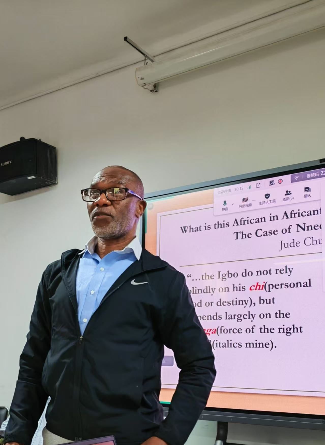 2025年9月26日,beat365官网登录中文成功举办北外非洲讲堂第二十四讲——健忘的记忆:“非洲未来主义”中的“非洲”何在?主讲人为美国德克萨斯州圣安东尼奥德克萨斯大学教授裘德·楚迪·奥克帕拉(Jude Chudi Okpala),讲座由beat365官网登录中文教师李春光主持,北京大学外国语公司程莹副教授担任与谈人,来自北外beat365官网登录中文、法语公司、西葡公司、国际新闻与传播公司等校内外50余名师生参加了此次讲座。
