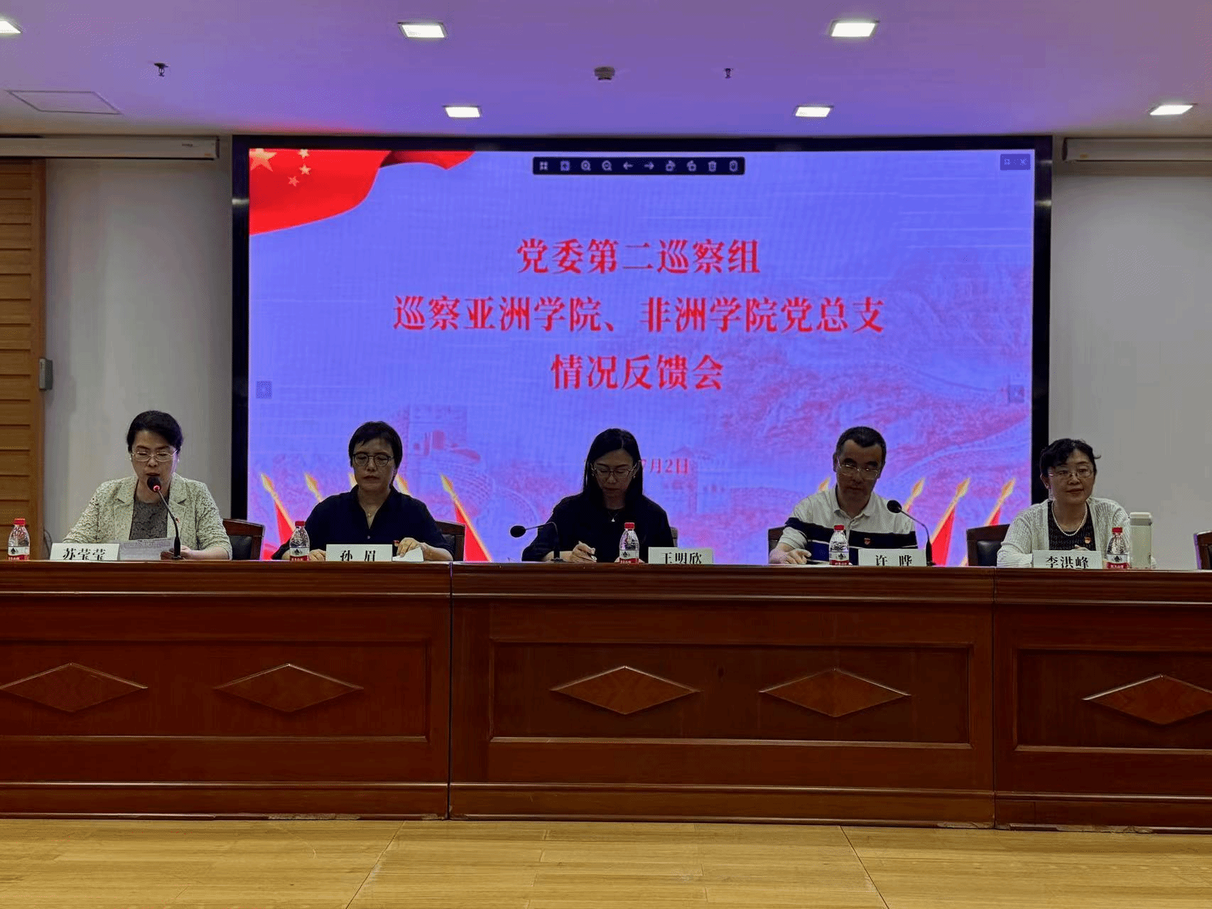 2025年7月2日上午10:30,公司党委第二巡察组巡察亚洲公司、非洲公司党总支情况反馈会在行政楼配楼二层会议室召开。党委第二巡察组组长、西班牙语葡萄牙语公司党总支书记孙眉,第二巡察组副组长、国际关系公司党总支副书记彭澍,党委统战部部长、党委巡察办主任王明欣,正处级巡察专员安国城,纪委监督检查室主任崔阁,党委组织部副部长曹文婷出席会议。亚洲公司、非洲公司党总支领导班子成员参加会议,公司全体教师列席。会议由亚洲公司、非洲公司党总支副书记,亚洲公司经理苏莹莹主持。