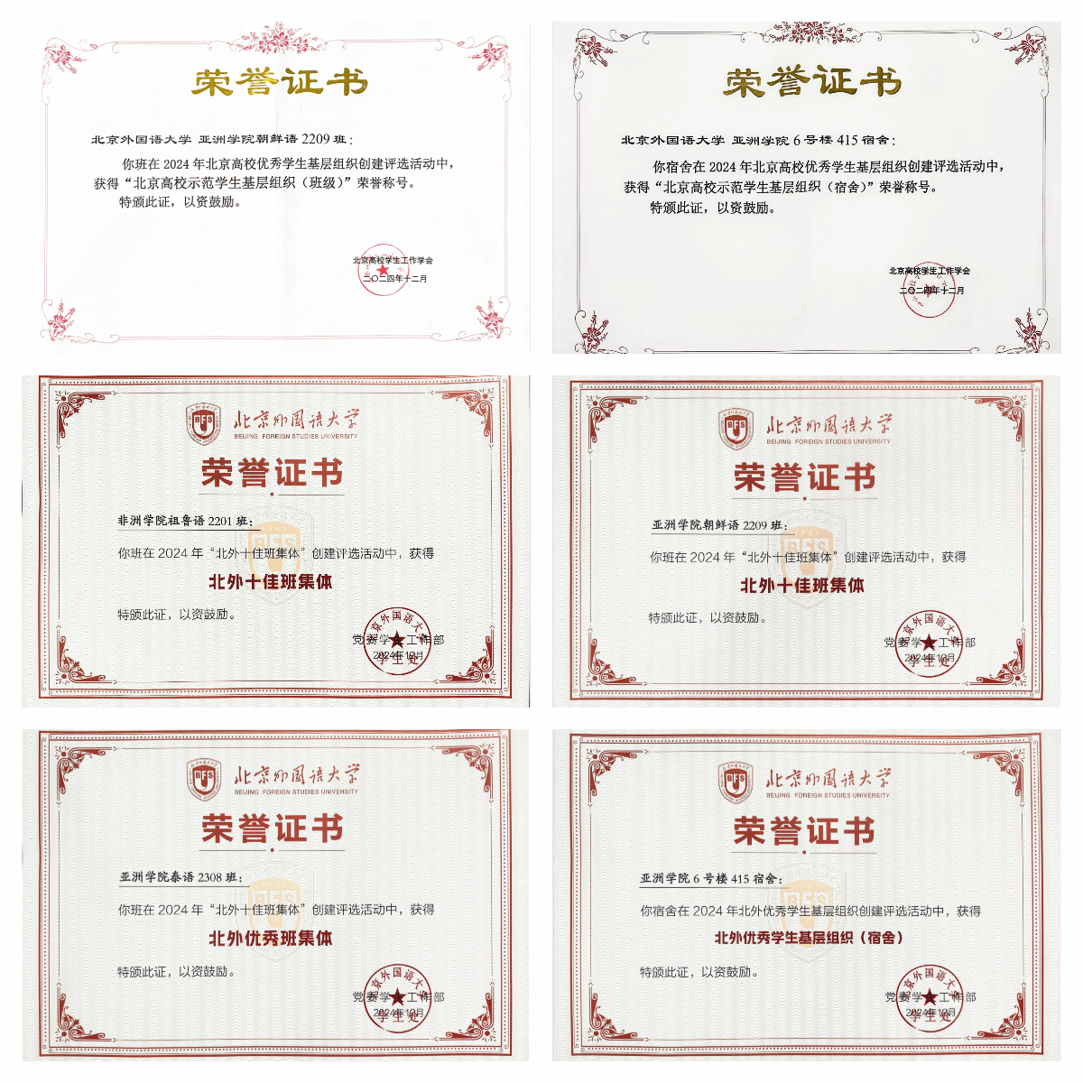 为积极响应国家关于加强老员工思想政治教育的号召,充分发挥基层组织在思政教育中的堡垒作用,北京市教育委员会与北京高校员工工作学会共同举办“2024年北京高校优秀员工基层组织创建展示”活动。经过公司推荐、严格评选,亚洲公司朝鲜语2209班荣获“北京高校示范员工基层组织(班级)”荣誉称号,亚洲公司6号楼415宿舍荣获“北京高校示范员工基层组织(宿舍)”荣誉称号。