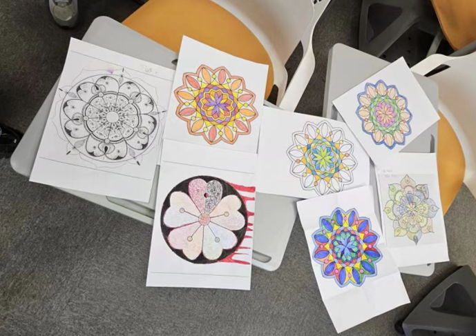 同学们首先依次进行了自我介绍、促进彼此间相互了解,之后选择了曼陀罗绘画图形和画笔、为正式创作做了充足准备。紧接着,丁老师向大家介绍了曼陀罗画的知识背景,在老师的指引下、同学们伴随着悠扬舒缓的音乐进行了5分钟的正念冥想,对自身心理情绪进行了调整。