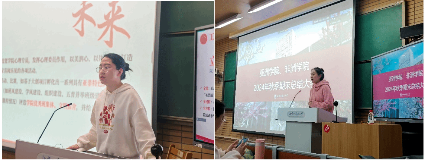 会议伊始,辅导员窦一鸣、孟雨莹分别就思政、资助、就业、党团等方面总结了本学期员工工作情况。窦一鸣从“乘风”、“破浪”、“开拓”、“未来”四个方面,分别介绍了五育并举班级建设情况、资助工作开展情况、外交部遴选及员工获奖情况。孟雨莹则从就业、党团等方面总结了2024年秋季学期员工工作情况,并强调了下学期即将开展的重点工作。